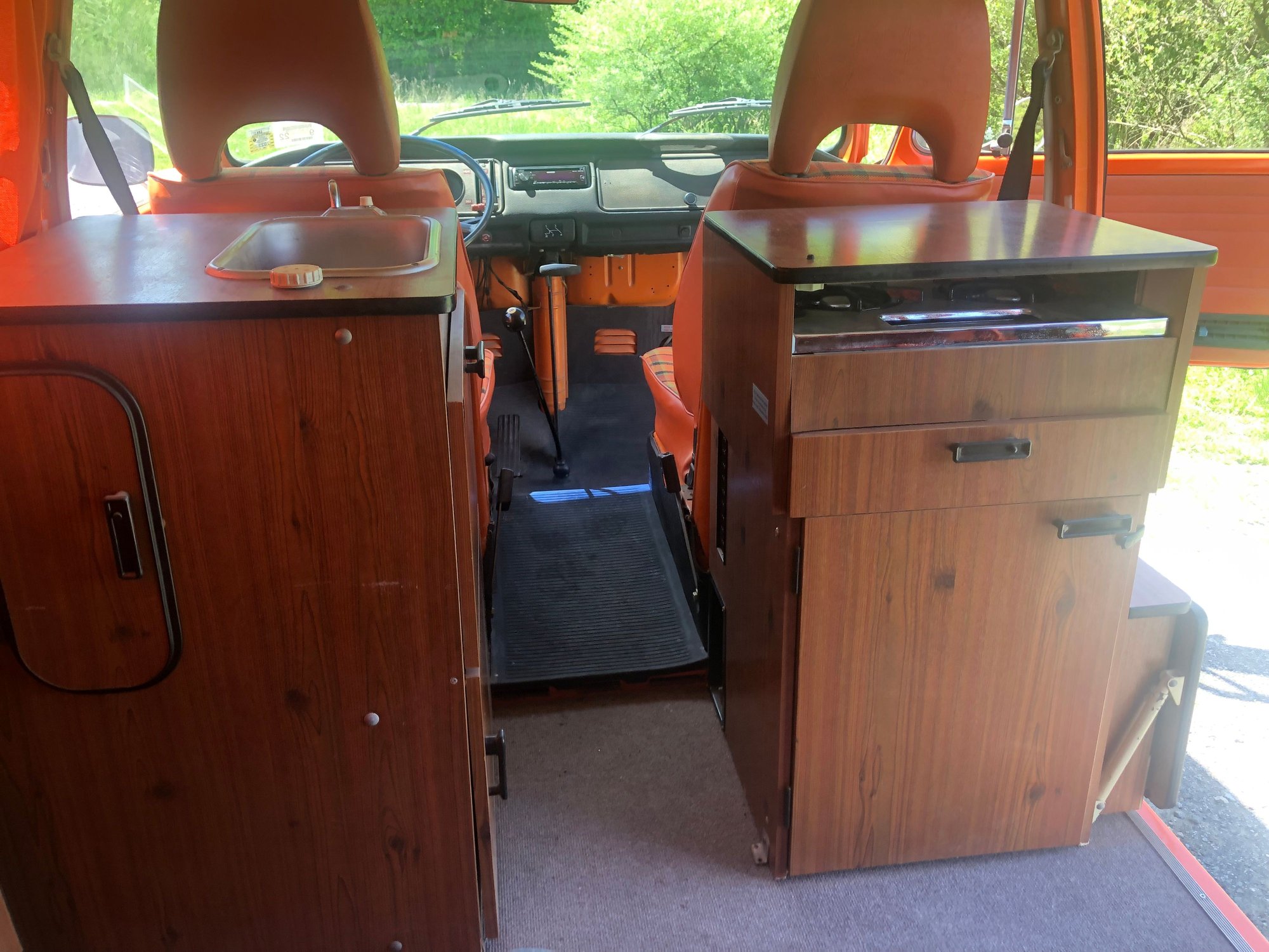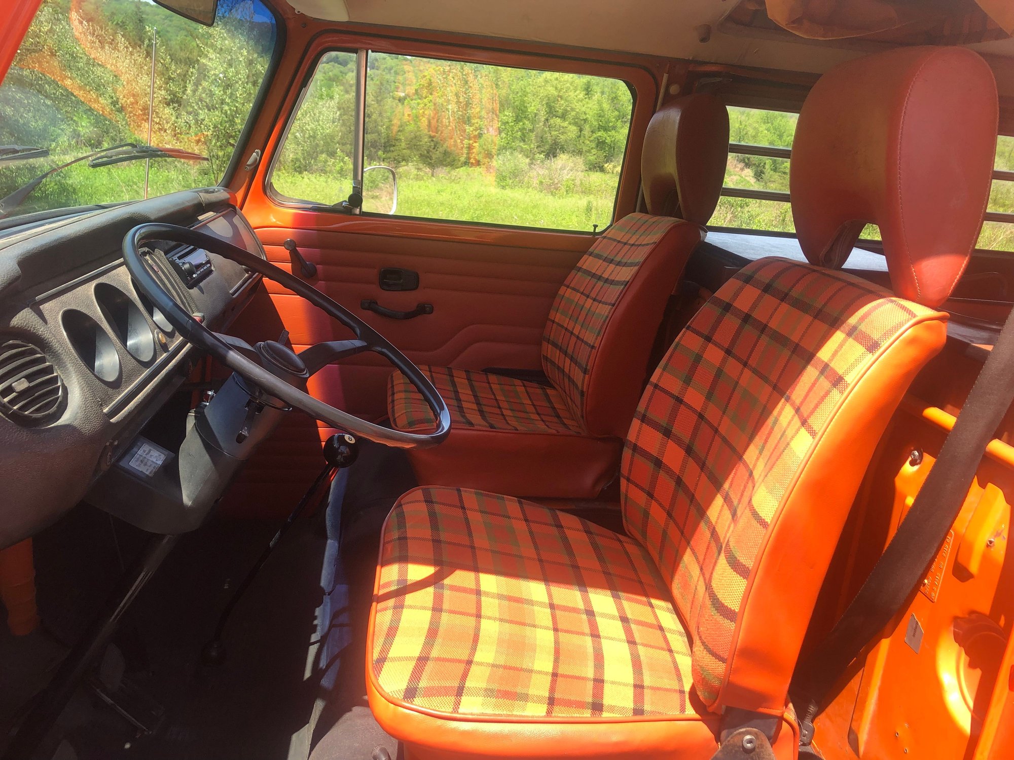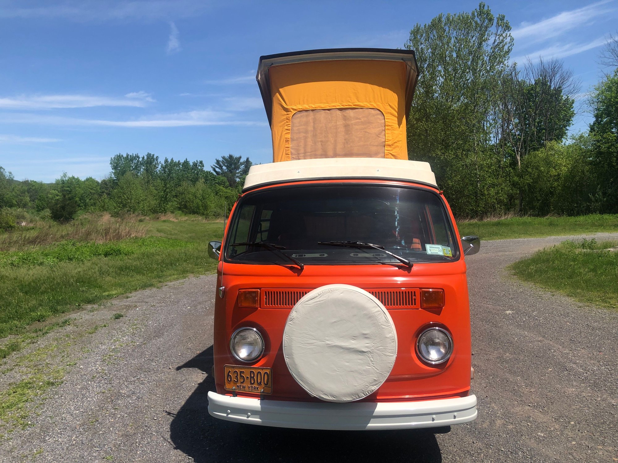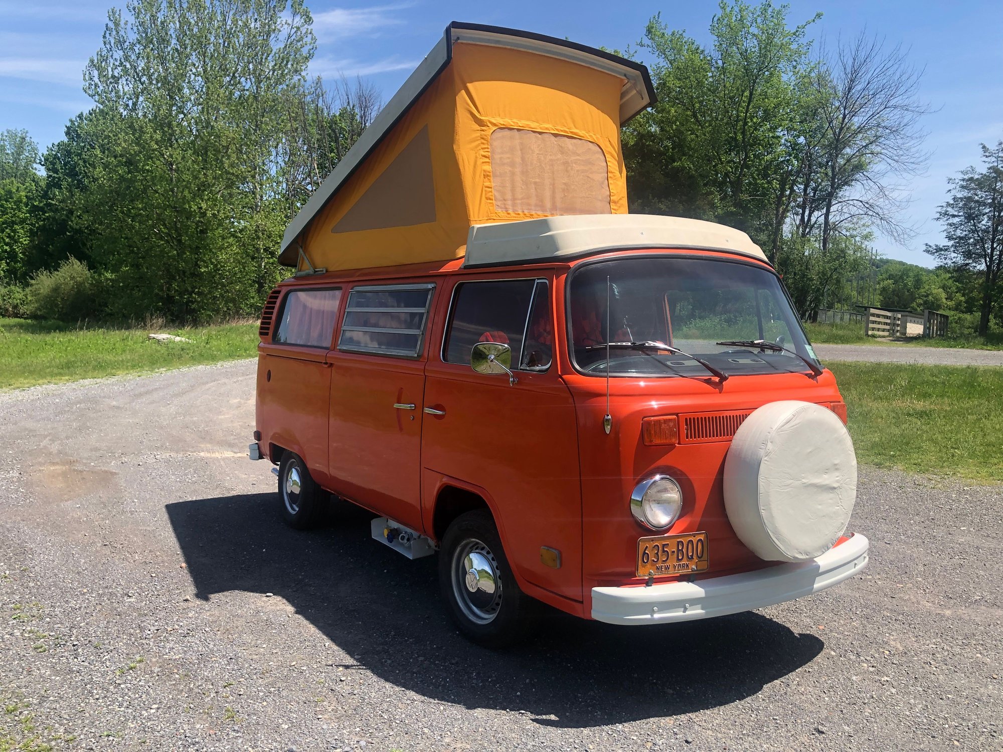 Best offer over 30k. 1975 Volkswagen Westfalia Camper bus, no rust! Sold New at Boulder Valley Volkswagen, Boulder Colorado. Comes with working original sink, propane stove, refrigerator and fold out table. Has exterior 110v power hookup. Original engine with carburetor conversion and original four-speed standard transmission. Sleeps 4 or more people by using upper bed and folding rock ‘n’ roll bed. Equipped with wardrobe closet and includes working AM/FM/CD player. New items include camper canvas with zip out vents, full set of window curtains, door interior panels, original plaid style front seats, five new tires, spare tire cover, antenna, all new interior mats and carpets, original style wheel covers, warm climate exhaust system with heater box delete, all new weatherstrips, window gaskets, front brake calipers, battery, emergency brake cable, all new interior wood panels, fuel tank and Bumpers. Vehicle has been completely refinished in original pumpkin orange color and undercarriage has been undercoated. Bumpers were refinished with original color as well. Sold with vintage 1975 New York license Plates, which can be registered and driven in New York. Also qualifies for antique auto insurance which is very inexpensive. For any further info please contact me at (518) 267-0977